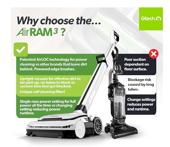 - UNIQUE DESIGN: The AirRAM 3’s powered brush head reaches awkward corners and cleans up to the edge of baseboards. The included hair removal tool picks up embedded pet hair and the anti-wrap bar prevents hair from catching.