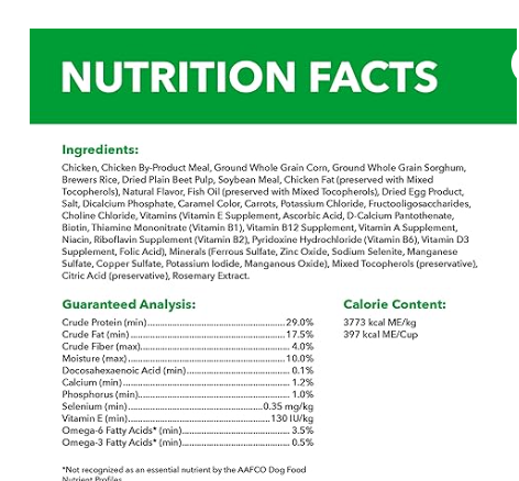 Chicken, Chicken By-Product Meal, Ground Whole Grain Corn, Ground Whole Grain Sorghum, Brewers Rice, Dried Plain Beet Pulp, Soybean Meal, Chicken Fat (preserved with Mixed Tocopherols), Natural Flavor, Fish Oil (preserved with Mixed Tocopherols), Dried Egg Product, Salt, Dicalcium Phosphate, Caramel Color, Carrots, Potassium Chloride, Fructooligosaccharides, Choline Chloride, Vitamins (Vitamin E Supplement, Ascorbic Acid, D-Calcium Pantothenate, Biotin, Thiamine Mononitrate (Vitamin B1), Vitamin B12 Supplement, Vitamin A Supplement, Niacin, Riboflavin Supplement (Vitamin B2), Pyridoxine Hydrochloride (Vitamin B6), Vitamin D3 Supplement, Folic Acid), Minerals (Ferrous Sulfate, Zinc Oxide, Sodium Selenite, Manganese Sulfate, Copper Sulfate, Potassium Iodide, Manganous Oxide), Mixed Tocopherols (preservative), Citric Acid (preservative), Rosemary Extract.